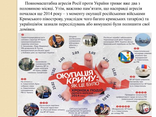 “Повномасштабна агресія #рф проти України триває вже майже 3 місяці. Утім, важливо пам’ятати, що насправді агресія почалася ще 2014 року – з моменту окупації російськими військами Кримського півострову, унаслідок чого багато кримських татар(ок) та українців/ок зазнали переслідувань або вимушені були полишити свої домівки.