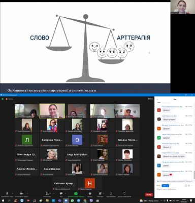 Ведуча, Olena Lutsenko, практичний психолог-методист, арттерапевт, методист Київського міського будинку учителя, ознайомила учасників з поняттям та перевагами арттерапії, можливостями та обмеженнями її використання в умовах закладу освіти.