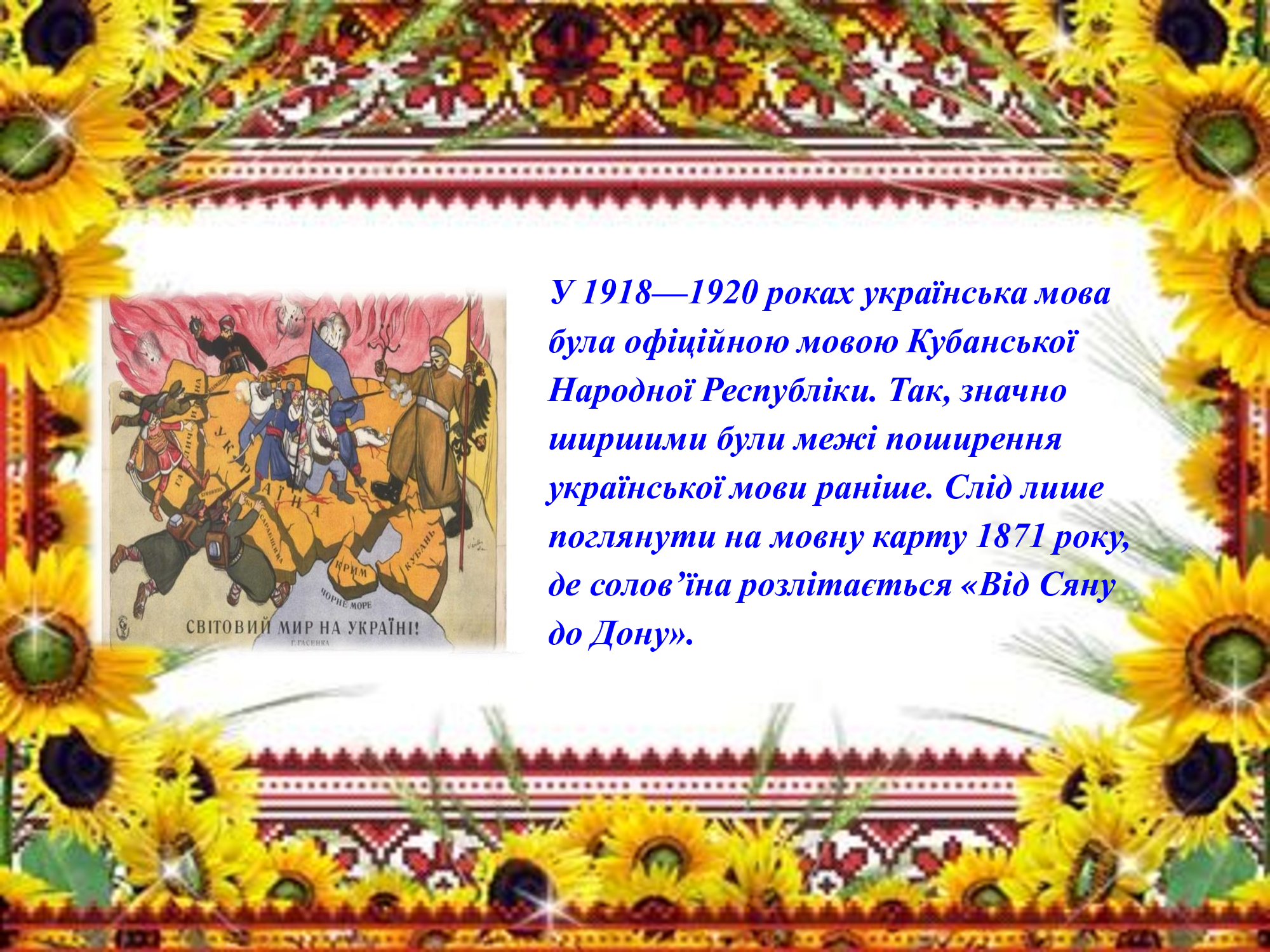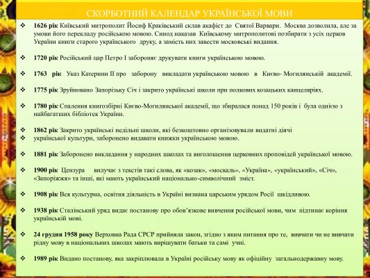 Упродовж століть наша мова зазнавала суттєвих утисків і заборон. Нині українська мова має державний статус.