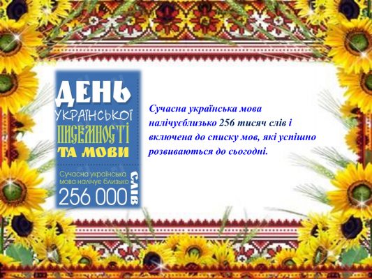 Сучасна українська мова налічує близько 256 тисяч слів і включена до списку мов, які успішно розвиваються, вважається однією з найкрасивіших та визнана другою за мелодійністю мовою світу після італійської.