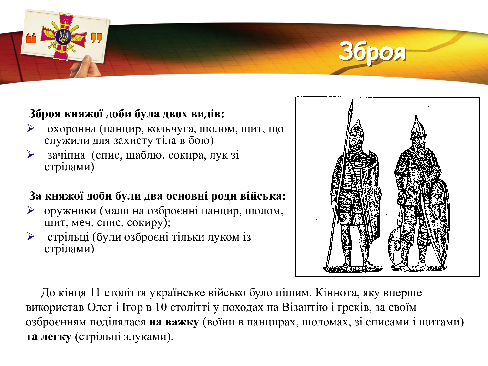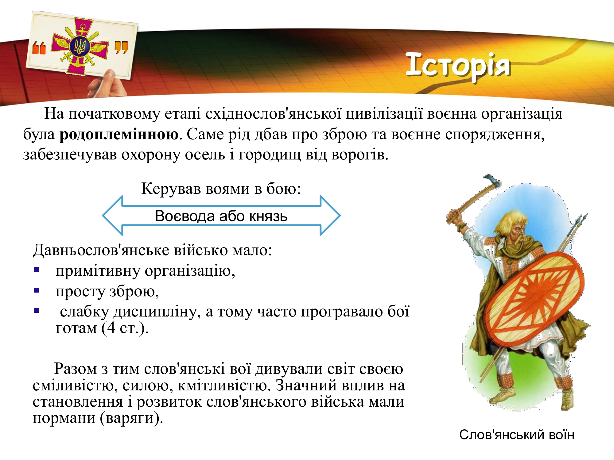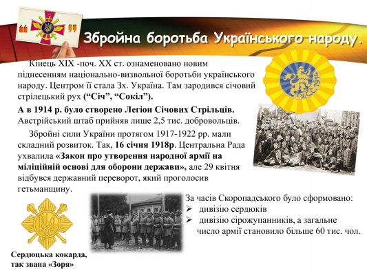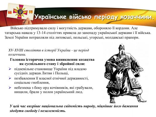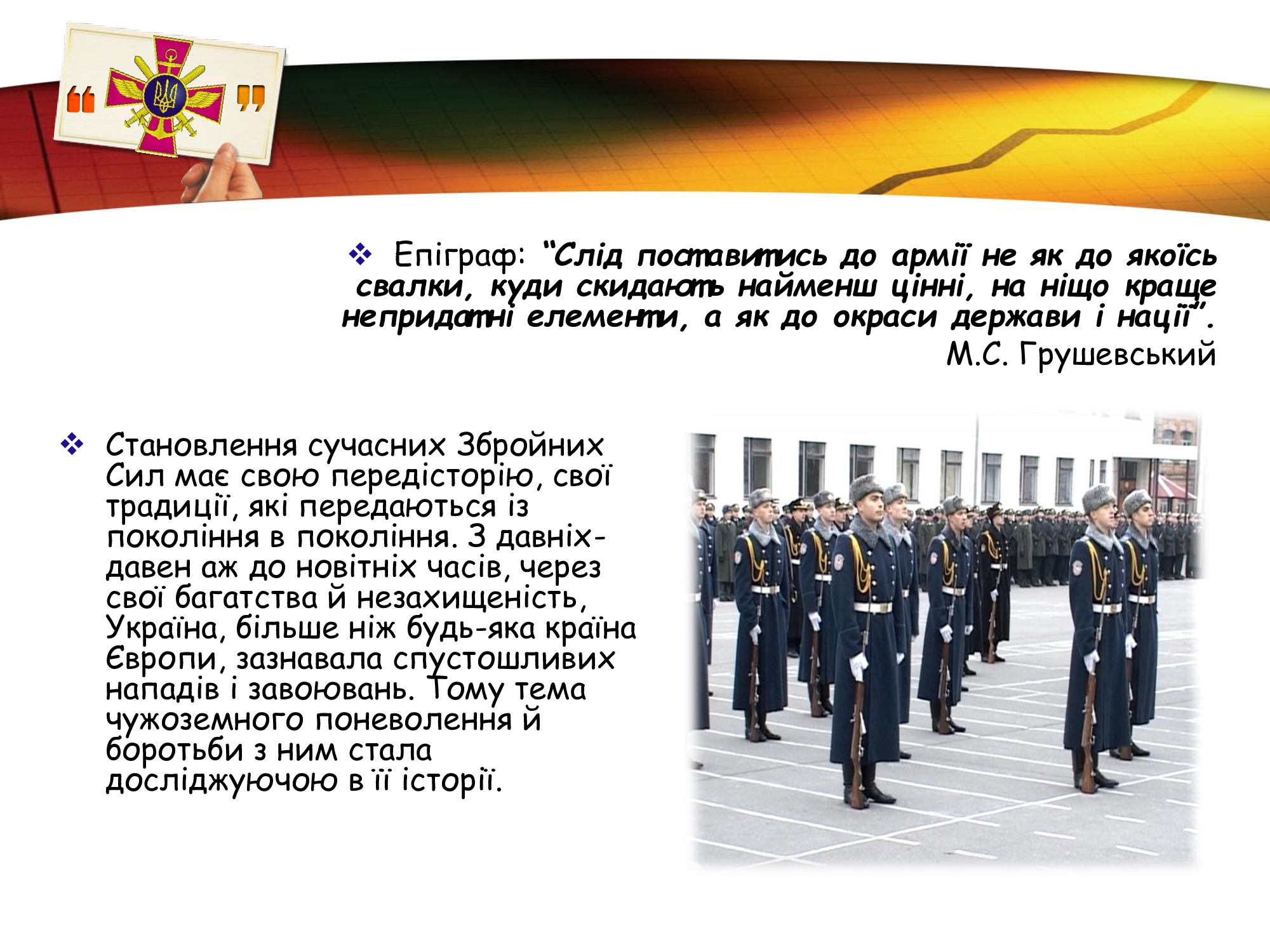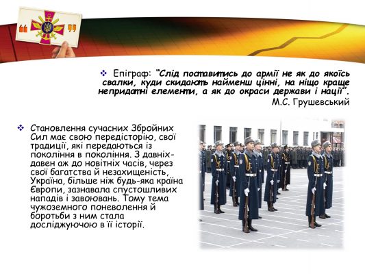 За плечима військових Збройних Сил України- славні традиції предків, великі звитяги козацтва та багатьох поколінь українців, які протягом віків здобували перемогу над загарбниками. Захист незалежності та територіальної цілісності рідної землі в усі часи був покликанням та обов’язком справжніх патріотів.