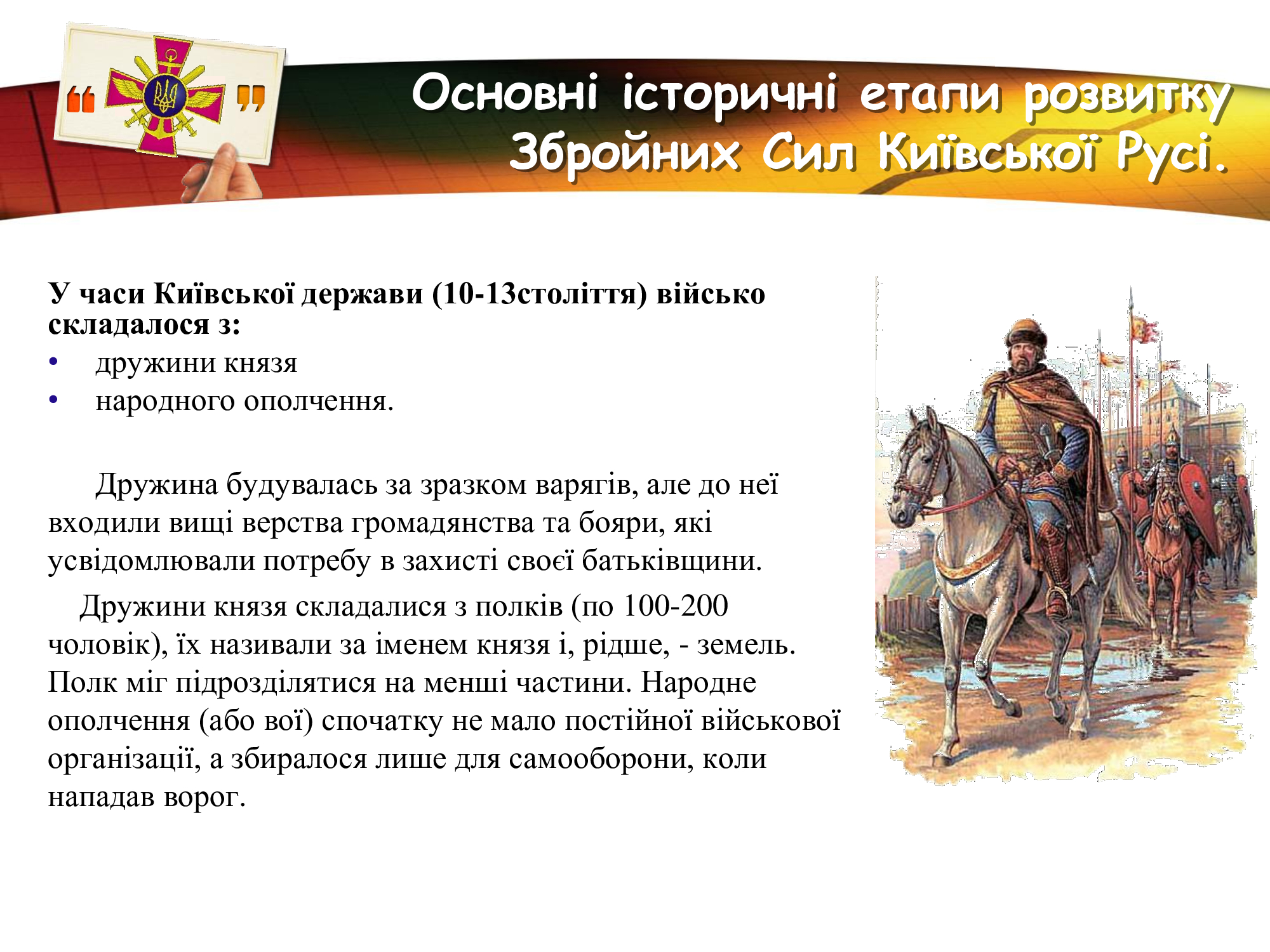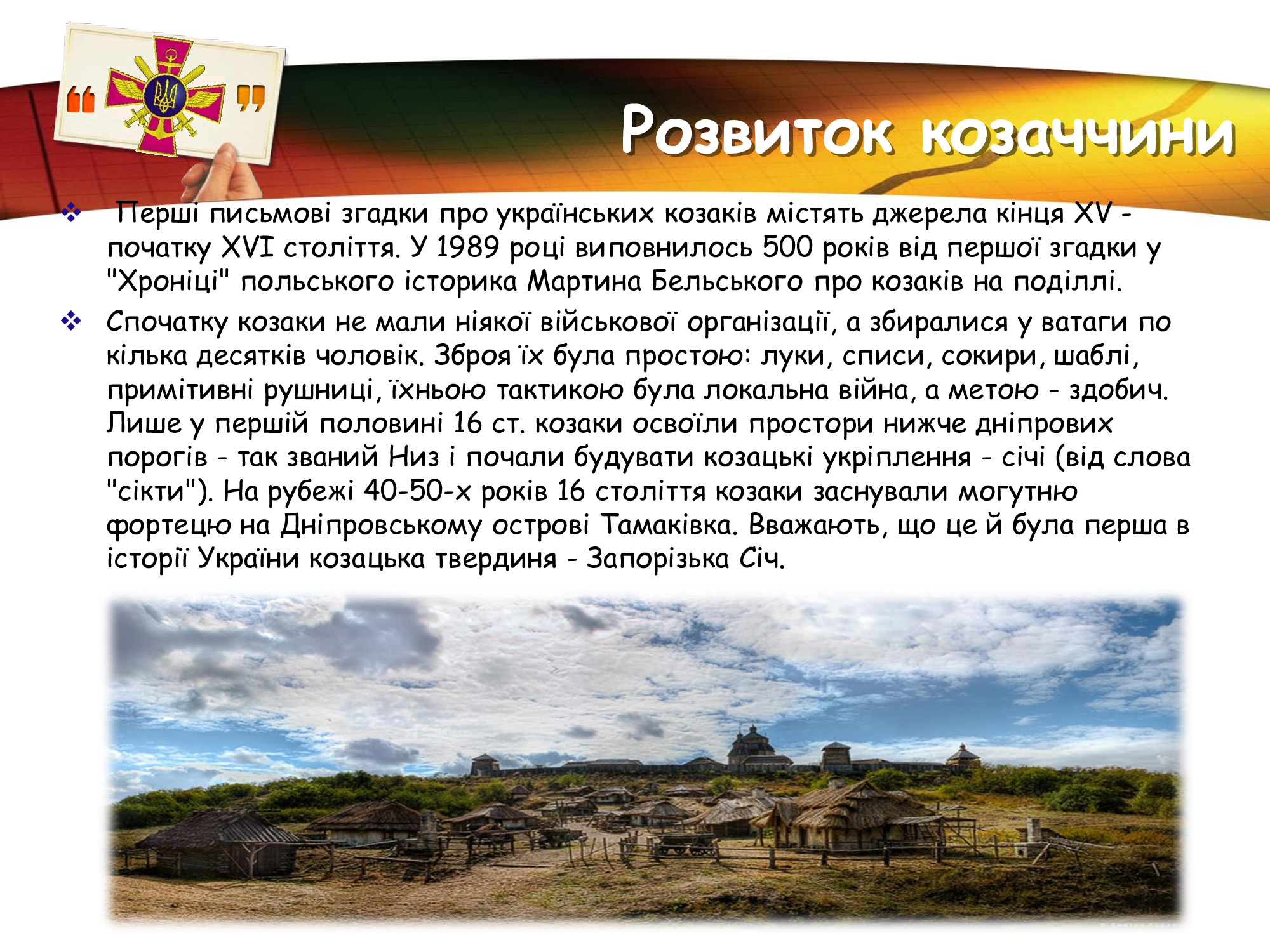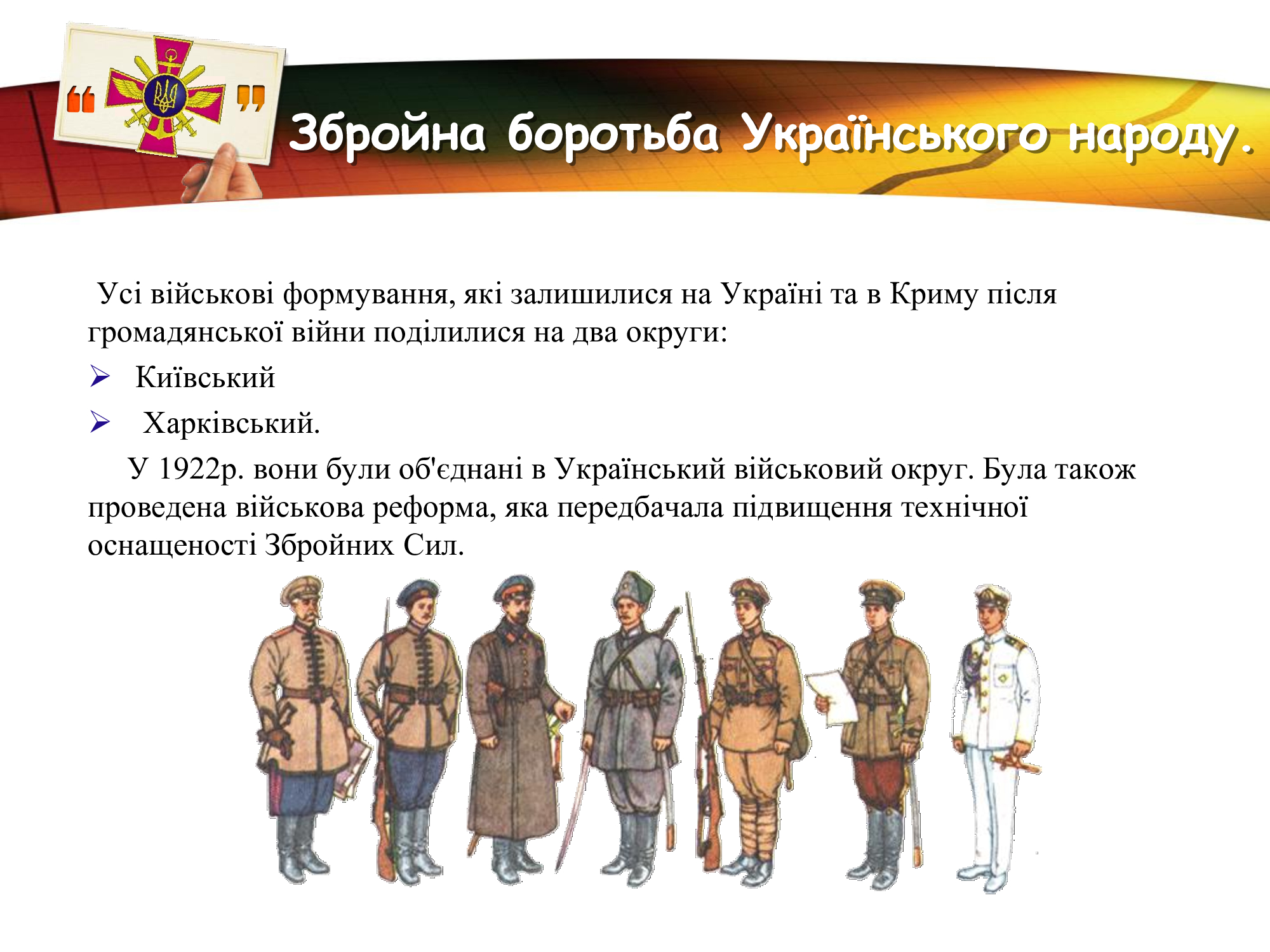 За плечима військових Збройних Сил України- славні традиції предків, великі звитяги козацтва та багатьох поколінь українців, які протягом віків здобували перемогу над загарбниками. Захист незалежності та територіальної цілісності рідної землі в усі часи був покликанням та обов’язком справжніх патріотів.