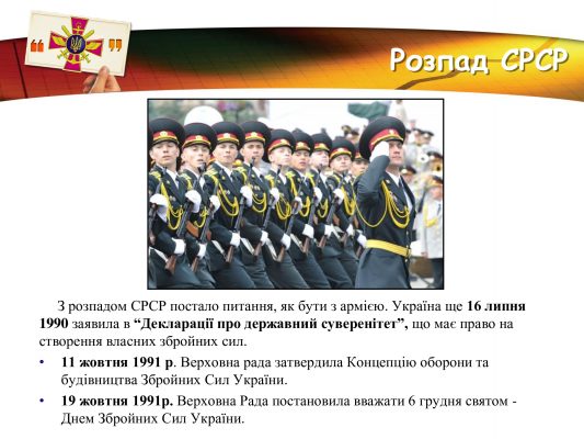 Збройні сили – це один з основних елементів стабільного і впевненого розвитку Української держави, справжня гарантія державного суверенітету. Тому у цей день ми вшановуємо всіх, хто причетний до високого і почесного звання військовослужбовця, хто обрав для себе нелегку, але достойну професію – захищати Україну, її суверенітет і незалежність.