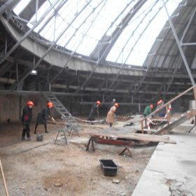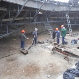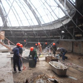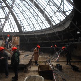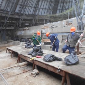 Бите скло, будівельне сміття збирали працівники Будинку учителя під куполом будівлі. Внаслідок жовтневого ракетного удару більша частина скляного купола була зруйнована чи сильно пошкоджена, знаходитись під ним було небезпечно. І тільки зараз, завдяки злагодженій роботі працівників, вдалося розгрести сміття, винести бите скло і навести лад.