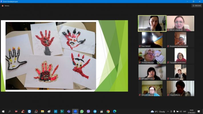 27.04.2023 для педагогічних працівників (вчителів, вихователів, практичних психологів, соціальних педагогів, асистентів вчителів) закладів освіти України був проведений 8-й методичний вебінар проекту «Психопрофілактика тривожних станів засобами арттерапії», що реалізується Київським міським будинком учителя спільно з ВГО «Арт-терапевтична асоціація».