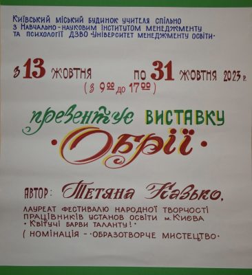 Відділ виховної роботи та художньої творчості 13 жовтня провели відкриття персональної виставки лауреата фестивалю народної творчості працівників установ освіти м.Києва “Квітучі барви таланту!” (номінація “образотворче мистецтво”) Тетяни Казько під назвою “Обрії”.
