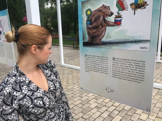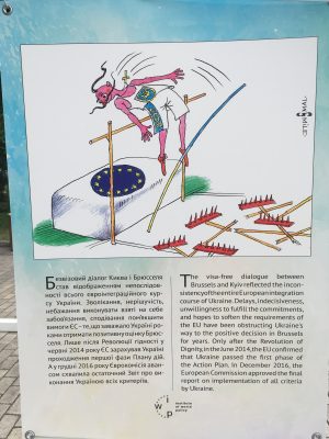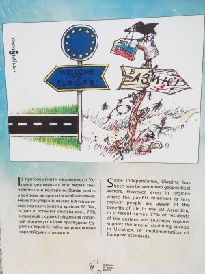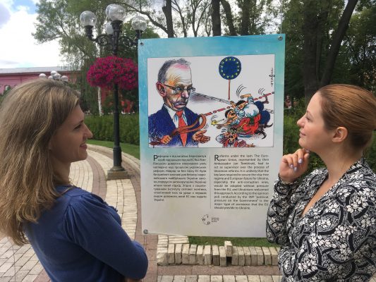 Також там представлені роботи відомих українських карикатуристів, в яких з гумором відображено нелегкий і довгий шлях повернення нашої країни в європейську сім’ю. Виставка працює до кінця червня.