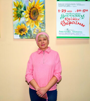 Наступною презентувала свою виставку Агежанова Марина вчитель образотворчого мистецтва спеціалізованої школи №76 імені Олеся Гончара Святошинського району. Життєве кредо мсткині з яким живе по життю: ” Той, хто мислить позитивно, має рішення для будь-якої проблеми; той, хто мислить негативно, має проблему в будь-якому рішенні”. Свою виставку назвала “Квіти України”. На відкриття експозиції завітали гості із Київського міського педагогічного університету імені Бориса Грінченка, а також були присутні представники Святошинської районної Профспілки, з вітальними словами виступила головний спеціаліст Святошинської районної Профспілки Тамара Мандрик.