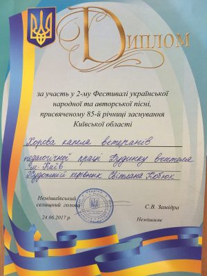 24 червня хорова капела ветеранів педагогічної праці ККПНЗ «Київський міський будинок учителя» (керівник Світлана Кобюк) нагороджена диплом за участь у ІІ пісенному фестивалі української народної та авторської пісні “Пісня єднає друзів”, присвячений 85-й річниці заснування Київської області, який проходив у приміщенні Немішаївського міського будинку культури