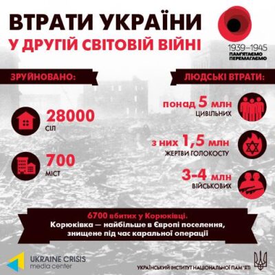 Внаслідок Другої світової війни (за повоєнними підрахунками), було зруйновано майже 700 українських міст і 30 тис. сіл, спалено близько 320 тис. господарств. Без житла залишилося понад 10 млн осіб.