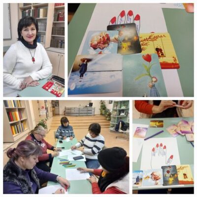 14 жовтня відбулося чергове заняття на базі Публічна бібліотека “Сузір’я” ЦБС Оболонського району м. Київ. Сьогодні знову психологічні практики: це планування, вміння розпізнавати свої емоції, слухати себе і свої бажання, техніка “безпечного місця”. Методист, практичний психолог відділу методичної та психосоціальної підтримки Будинку учителя – Світлана Шумило. “Клаптиковий пейзаж” “Намалюю обличчя”