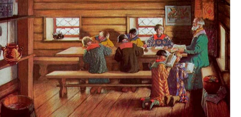 Згодом початок навчання перенесли на 1 вересня.З самого ранку сім’я йшла в церкву молитися Науму і просити благословення на навчання. Після служіння всі вирушали додому, аби достойно зустріти і пригостити вчителя, а ще — представити йому свого учня. Майбутній вихованець тричі вклонявся наставнику, а той три рази легенько бив його батогом. Мати при цьому обов’язково повинна була голосно заплакати, інакше будуть говорити, що вона безсердечна. Після цього мати садила дитину за стіл, а вчитель починав вести урок. Він розкривав абетку, і матері належало плакати і голосити ще сильніше. Коли закінчувався перший урок, проведений 14 грудня, то вчителям дарували коровай і рушник. Часто проводи та частування затягувалися до воріт будинку. Після цього учень уже сам вирушав до вчителя з абеткою, указкою і подарунком.