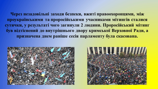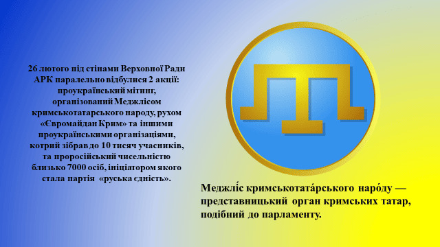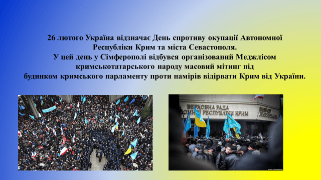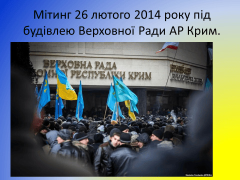 26 лютого на заклик Меджлісу кримськотатарського народу до Верховної Ради Криму вийшли тисячі кримських татар, українців та представників інших національностей чинити спротив російській окупації та заявили світу про цілісність України. Мітинг зібрав від 5 до 10 тисяч учасників. Наступного дня, о 5-й ранку до парламенту та уряду АРК увійшли регулярні військові формування РФ і захопили будівлі.