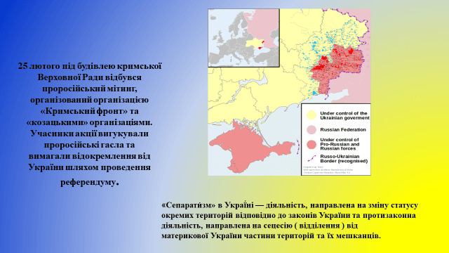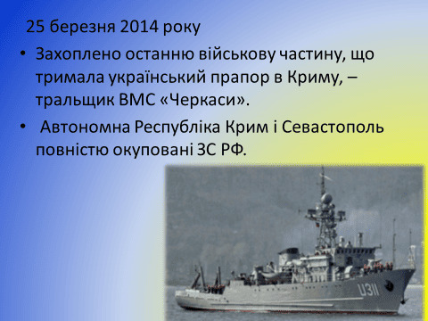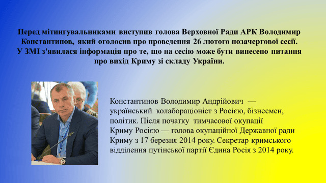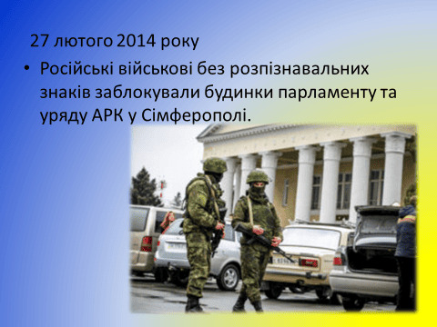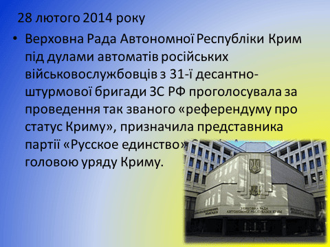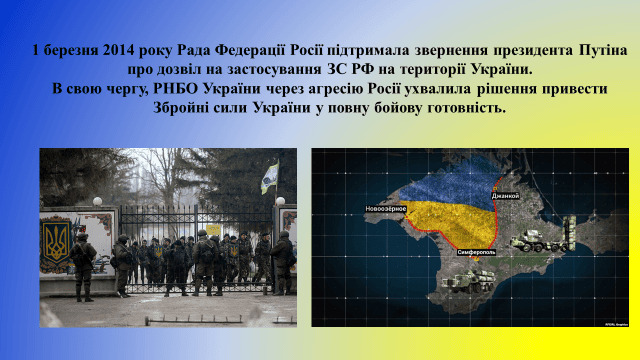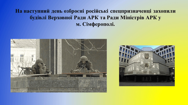 28 лютого Верховна Рада Криму під «наглядом» військовослужбовців ЗС РФ проголосувала за проведення референдуму про статус Криму. Того ж дня підрозділи ЗС РФ розпочали блокування українських військових частин та об’єктів на півострові, захопили аеропорти Бельбек і Сімферополь, сухопутні в’їзди до Криму з боку Херсонщини.