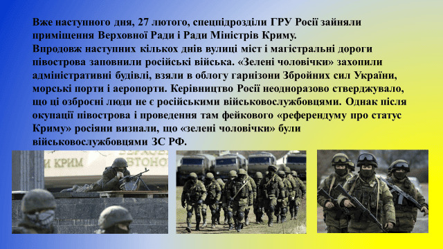 У лютому – березні конфлікт розвивався в Криму. Туди зайшли російські військові без розпізнавальних знаків; із місцевих жителів створювали та озброювали іррегулярні формування найманців, їх використовували разом із підрозділами збройних сил РФ, дислокованими в Криму. На півострові встановили режим воєнної окупації.