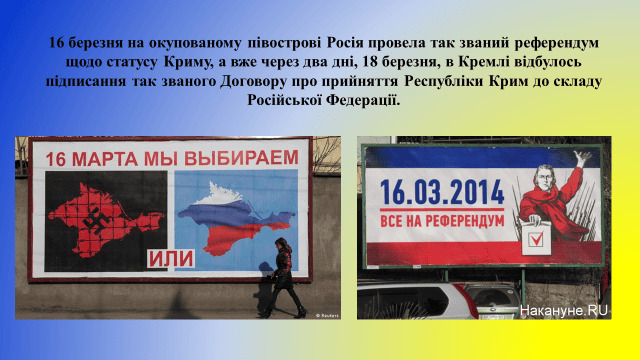 16 березня 2014 року відбувся псевдореферендум про статус Криму. Цей захід, зрежисований Росією, бойкотували кримські татари та інші проукраїнськи налаштовані жителі півострова. 25 березня захоплено останню військову частину, що тримала український прапор у Криму – морський тральник «Черкаси» ВМС України. Відтоді Автономна Республіка Крим і місто Севастополь окуповані збройними силами Росії.