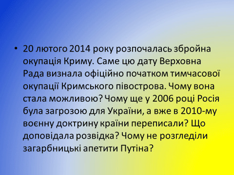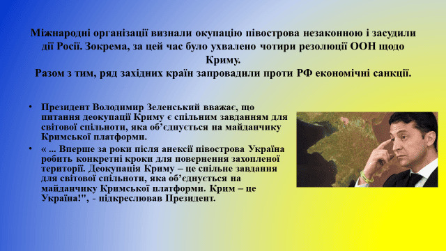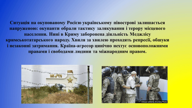 Війна Росії проти України почалася з Криму. Тимчасова окупація Автономної Республіки Крим та міста Севастополя російськими регулярними з’єднаннями й підрозділами, підпорядкованими міністерству оборони РФ, підрозділами та спеціальними формуваннями, підпорядкованими іншим силовим відомствам РФ, їхніми радниками, інструкторами та іррегулярними незаконними збройними формуваннями, озброєними терористичними бандами та групами найманців, створеними, підпорядкованими та фінансованими росією, та спроба його анексії, що триває вже 9 років, є актом кричущого порушення норм і принципів міжнародного права, суверенітету й територіальної цілісності України.