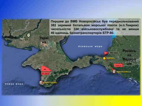 24 лютого 2014 року кораблі військово-морського флоту РФ, які охороняли морську акваторію в районі проведення Сочинської олімпіади, прийняли на борт у Новоросійську «зелених чоловічків» (російських військовослужбовців без розпізнавальних знаків ЗС РФ) разом із бойовою технікою та вийшли курсом на Севастополь.
