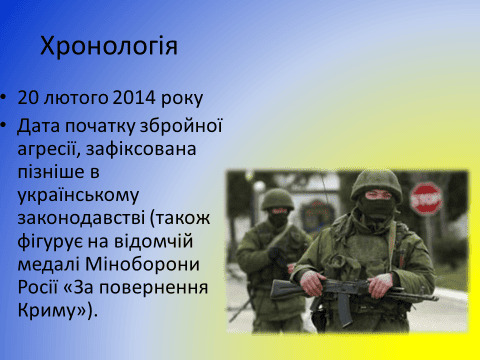 20 лютого 2014-го розпочалася активна збройна агресія росії проти України з переміщенням путінських підрозділів у Криму та в районі Керченської протоки. Ця дата зафіксована на відомчій медалі Міністерства оборони росії «За повернення Криму». А в заяві Верховної Ради України від 21 квітня 2015 року та в Законі України «Про внесення змін до деяких законів України щодо визначення дати початку тимчасової окупації» 20 лютого 2014 року визначено днем початку російської агресії.