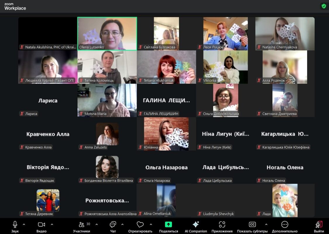 Ведуча – Олена Луценко, практичний психолог-методистка, арттерапевткиня, методистка Київського міського будинку учителя, членкиня ГС “Національна психологічна асоціація”, керівниця відокремленого підрозділу у м. Києві та членкиня правління ВГО «Арттерапевтична асоціація», презентувала варіанти застосування простих знайомих вправ для організації спільної творчої діяльності дітей та дорослих.