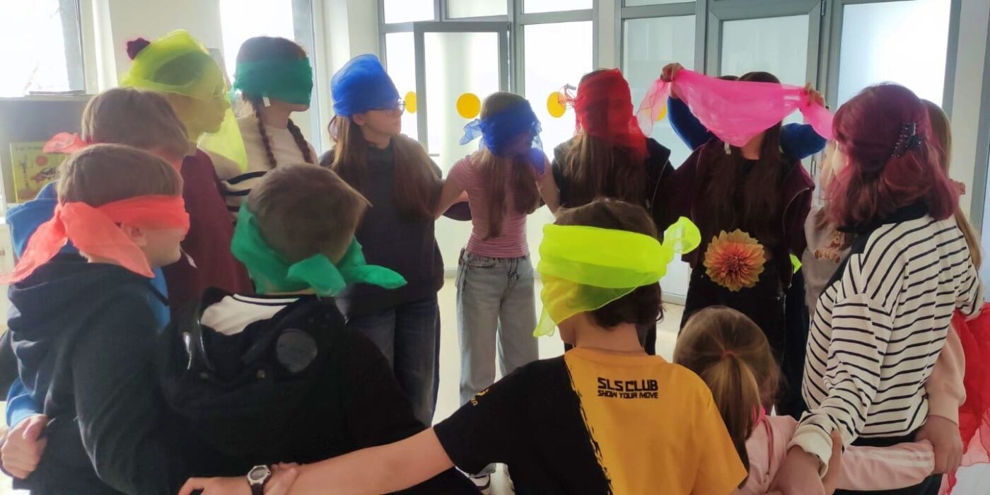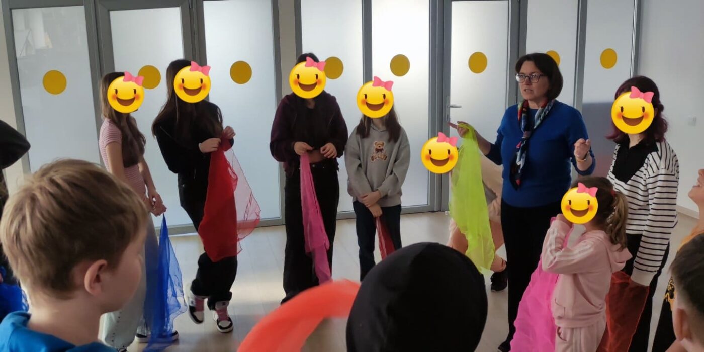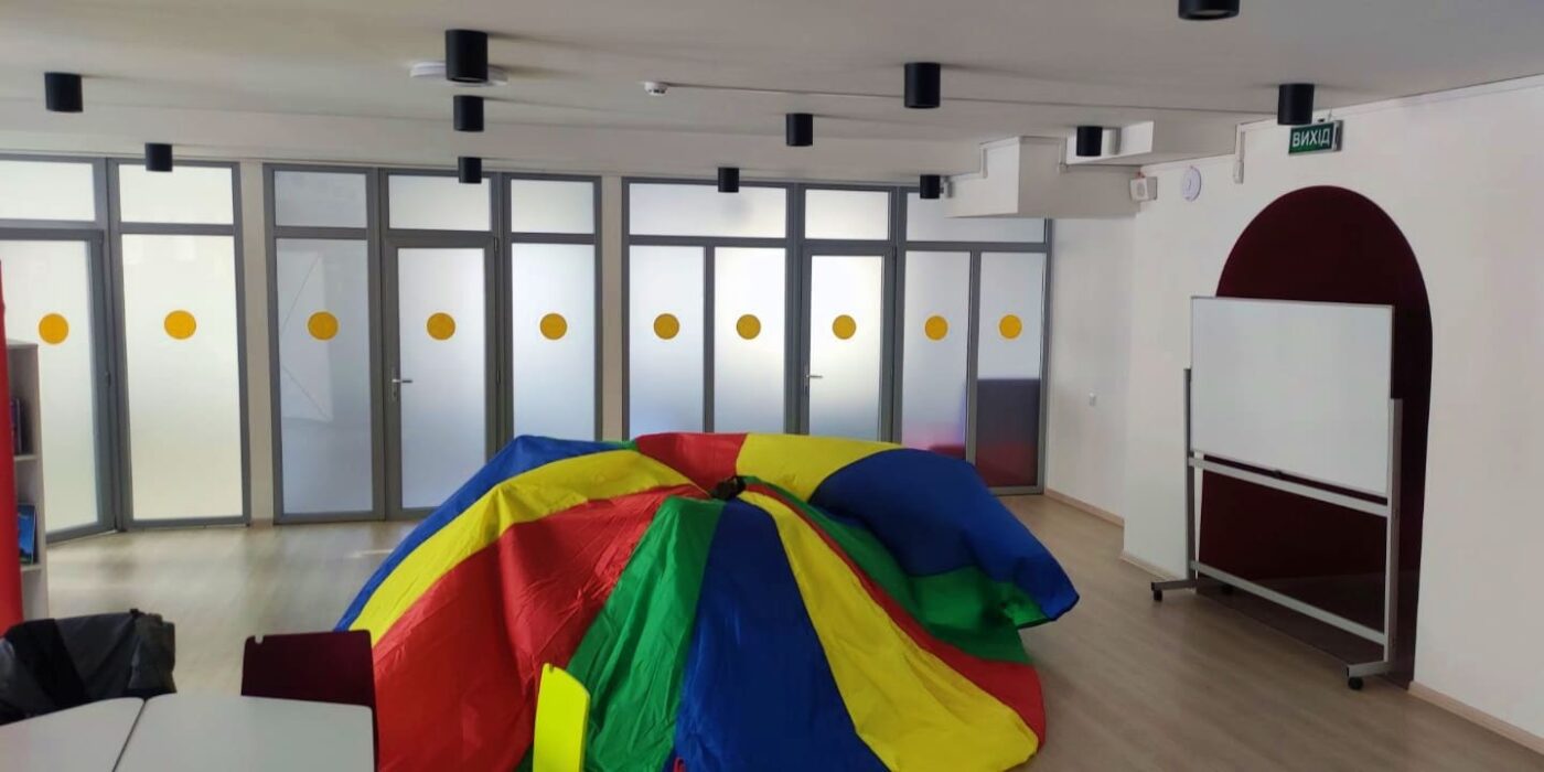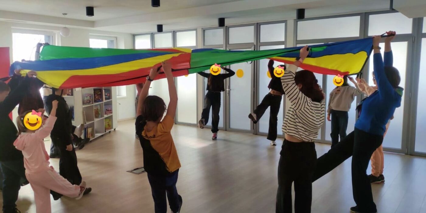 Розпочали зі знайомства через рух: за допомогою хустинок діти «розповідали» про свій настрій. Далі з парашутом гойдалися на «хвилях океану» та грали в рухливу гру на зміну місць. Було багато сміху і бурхливої енергії.