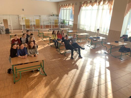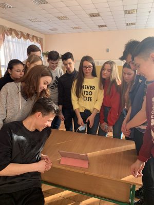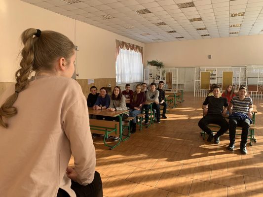 Керівник студії бального танцю “Дебют”, Андрусенко Марина,разом із студійцями провели вікторину – спілкування про історію танцю, учні познайомились з різними танцювальними стилями та дізнались про їх територіальні особливості. Головною метою було окреслення основних жанрових особливостей та прослідкування циклічності танцювальних стилів та моди ( залучений відео матеріал, який наглядно демонструє зміну музичного супроводу та костюмів протягом останніх 70-ти років https://youtu.be/p-rSdt0aFuw )