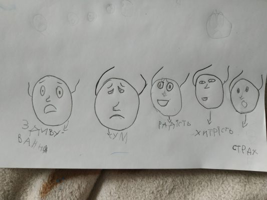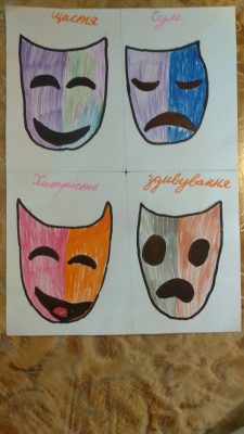 Продовжуючи роботу над темою емоцій, керівник студії акторської майстерності Олександра Сухенко, після онлайн заняття, дала вихованцям студії домашнє завдання у новій формі виконання, відобразити різні емоції на театральних масках у малюнку.